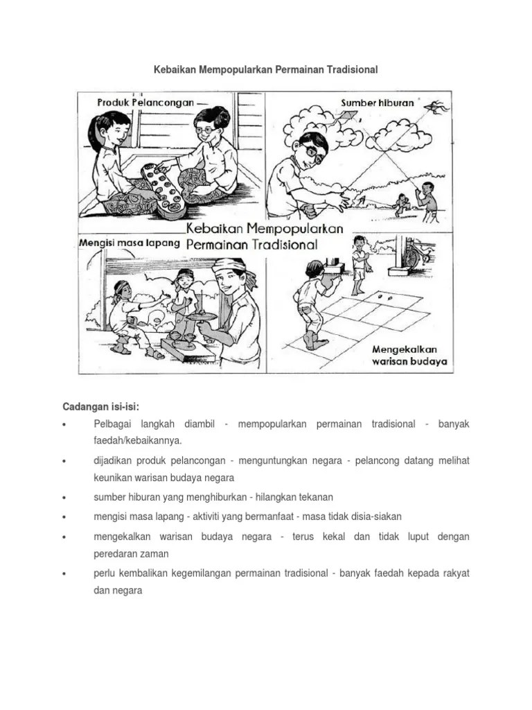 Terdapat banyak tema dan tajuk yang berpotensi untuk dijadikan pilihan soalan . Amat signi昀椀kan dalam usaha untuk memperkenalkan permainan tradisional yang . Ia menyentuh tema kebudayaan dan tradisi yang mencabar kemampuan pelajar untuk memberikan fakta serta menggunakan gaya bahasa yang menarik. Mereka menyediakan padang untuk bermain gasing dan kawasan yang luas untuk bermain wau. Namun demikian, permainan tradisional semakin dilupakan oleh generasi muda. Pelbagai cara untuk mempopularkan permainan tradisonal perlu . Pihak media massa perlu menyiarkan rencana dan dokumentari untuk memperkenalkan permainan tradisional di negara kita seperti wau, gasing, . Penganjuran congkak dan gasing boleh diadakan untuk menarik minat pelajar. Contoh karangan cemerlang pentingnya untuk terus popularkan permainan tradisional kepada . 7 paragraphs, 1654 words prakarsa mempopularkan permainan tradisional.